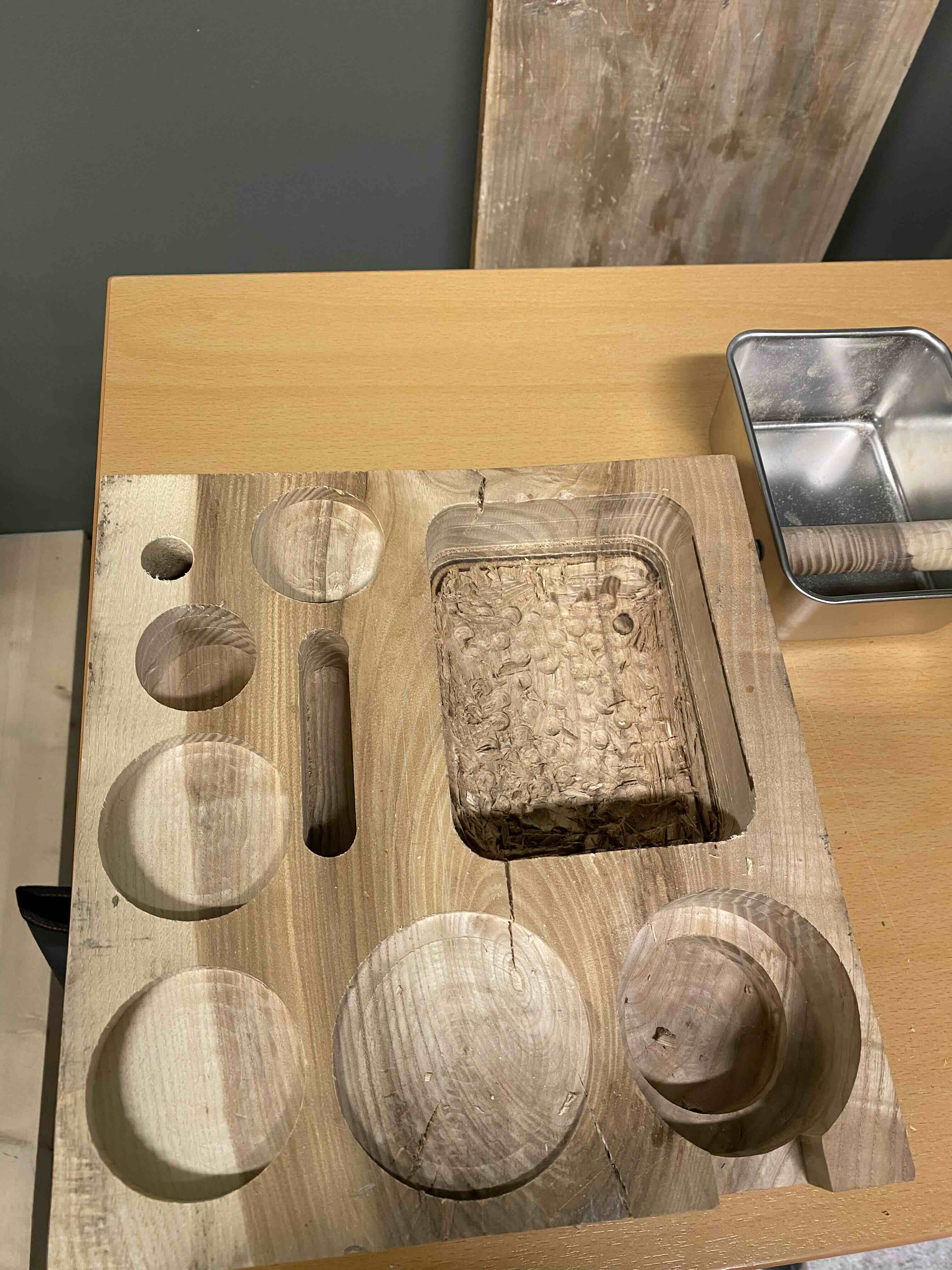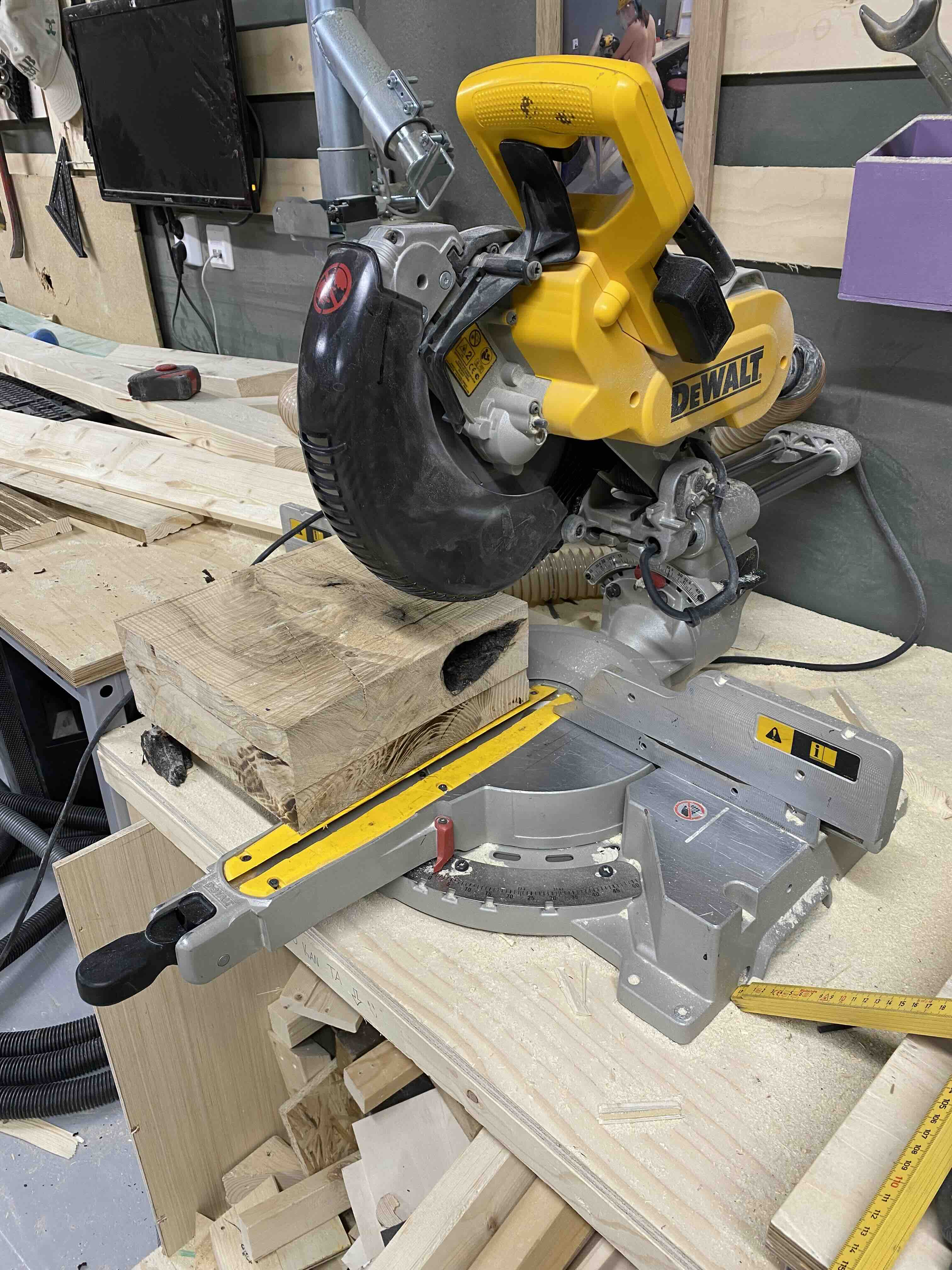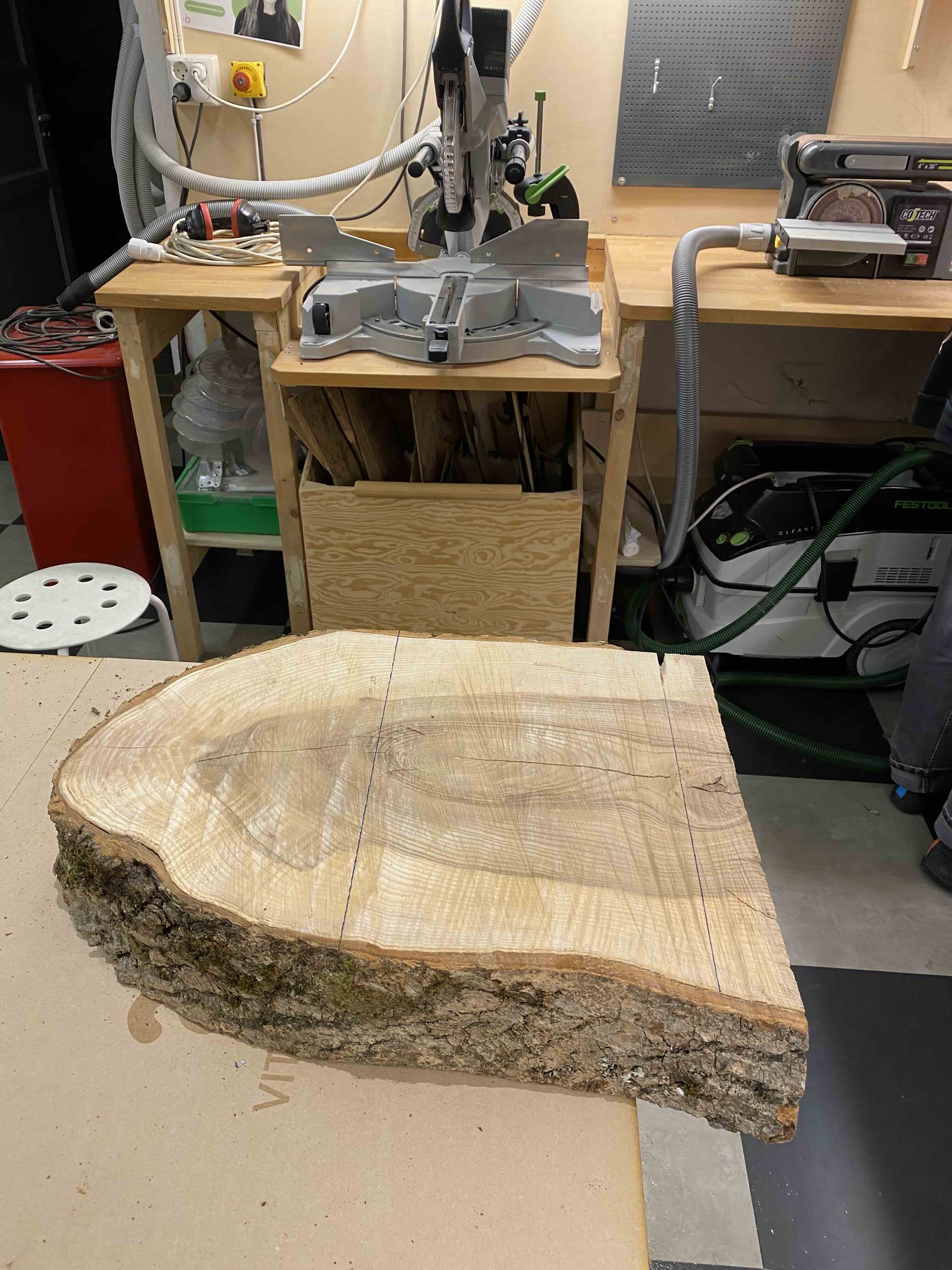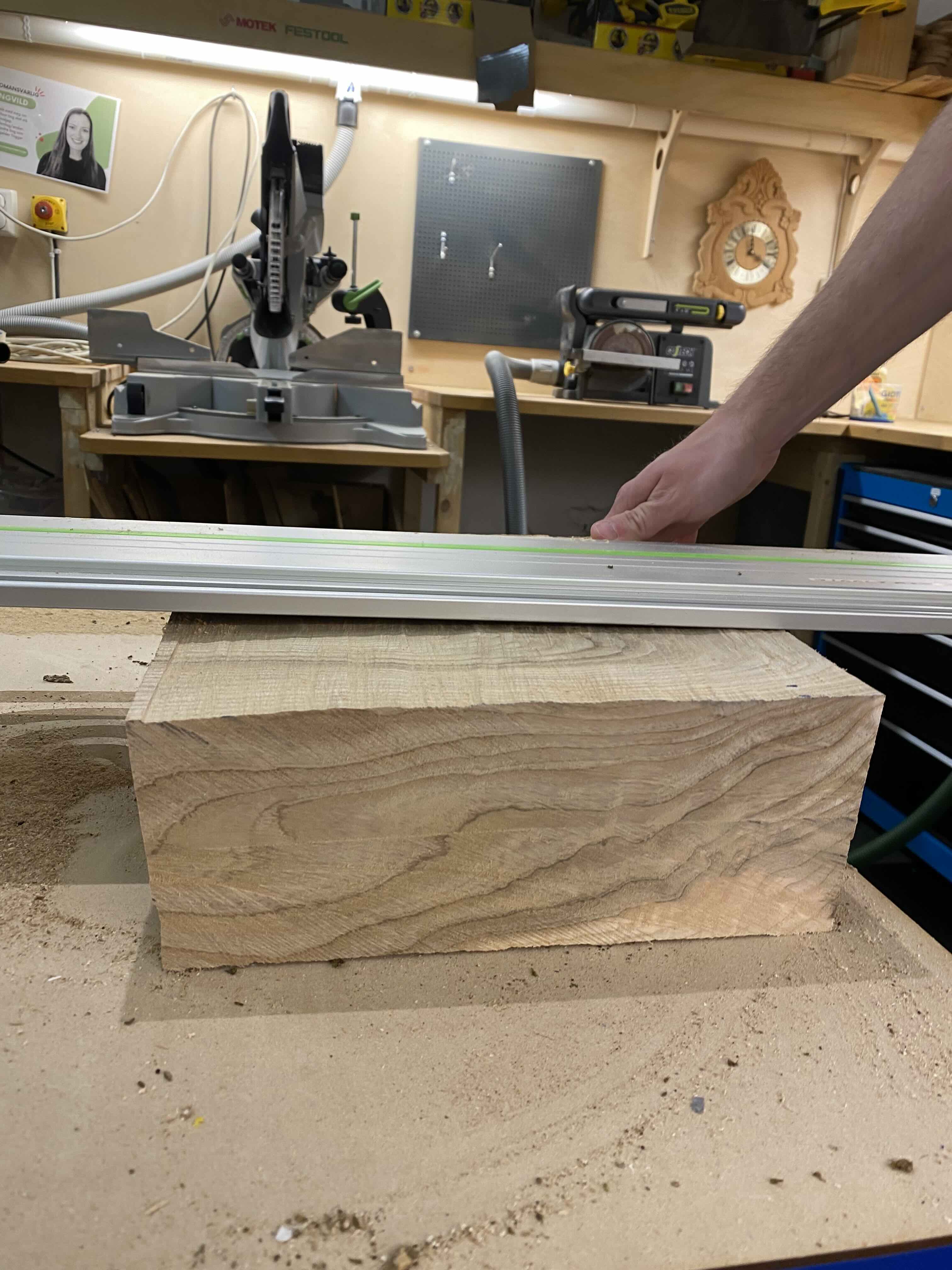 We began by cutting the wood down to approximately the size needed for the station. However, this process presented several challenges. Ash is a very hard wood, and it was difficult to find tools suitable for working with it. As a result, much of the initial work involved manual sawing to reduce the block to a more manageable size.
