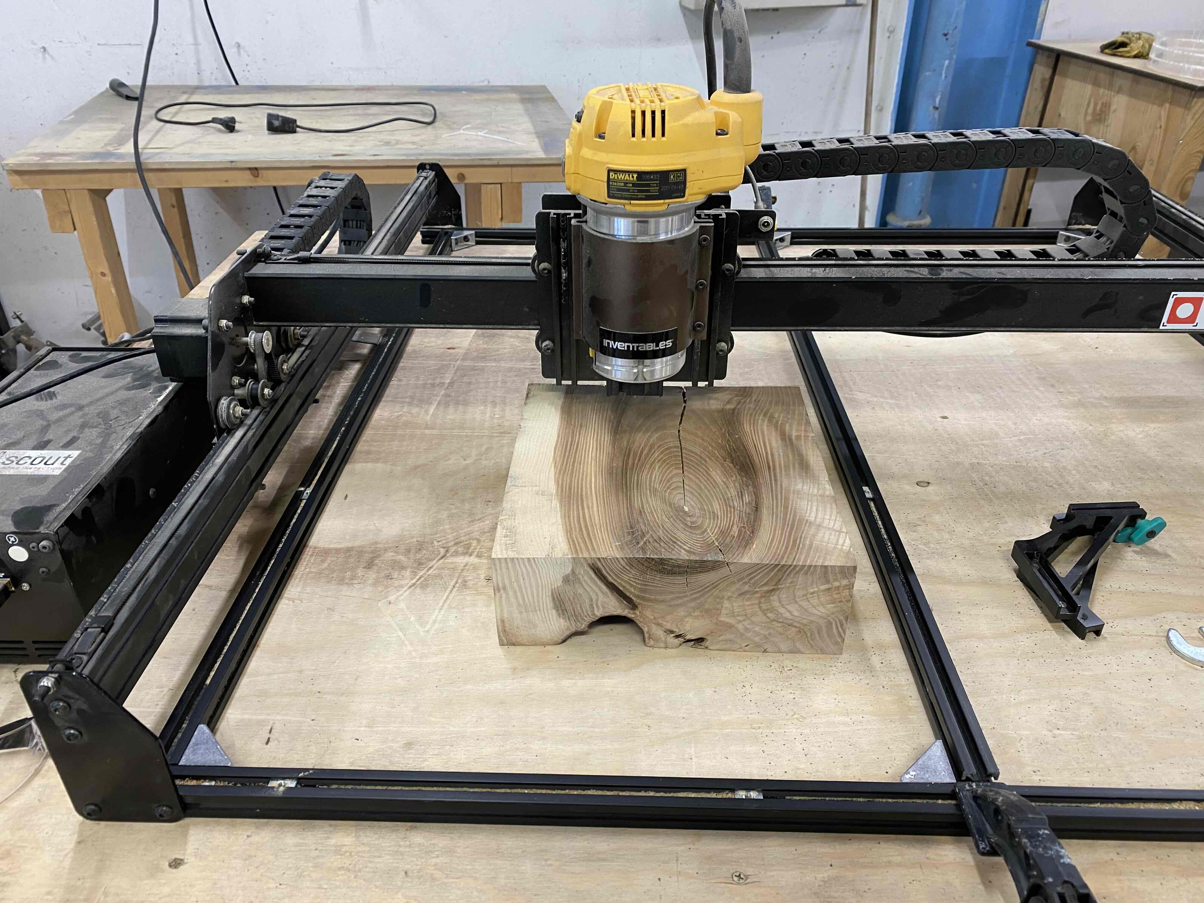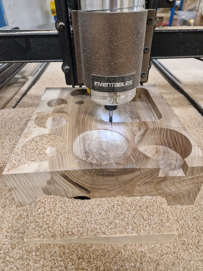 Once both the wooden block and all accompanying tools were ready, the milling process began. A CNC machine was used to cut out the slots and recesses based on the measurements and drawings from Fusion 360.