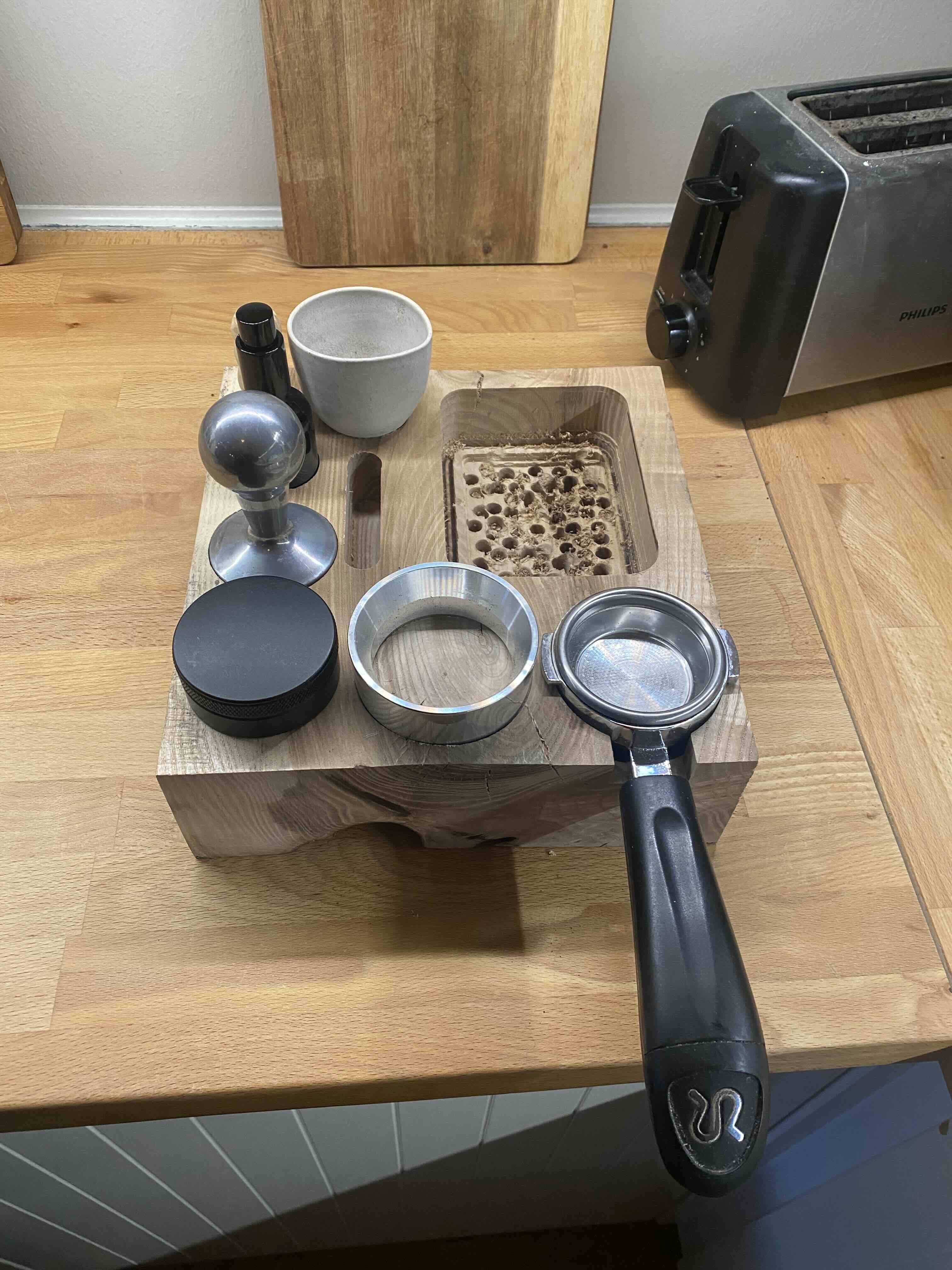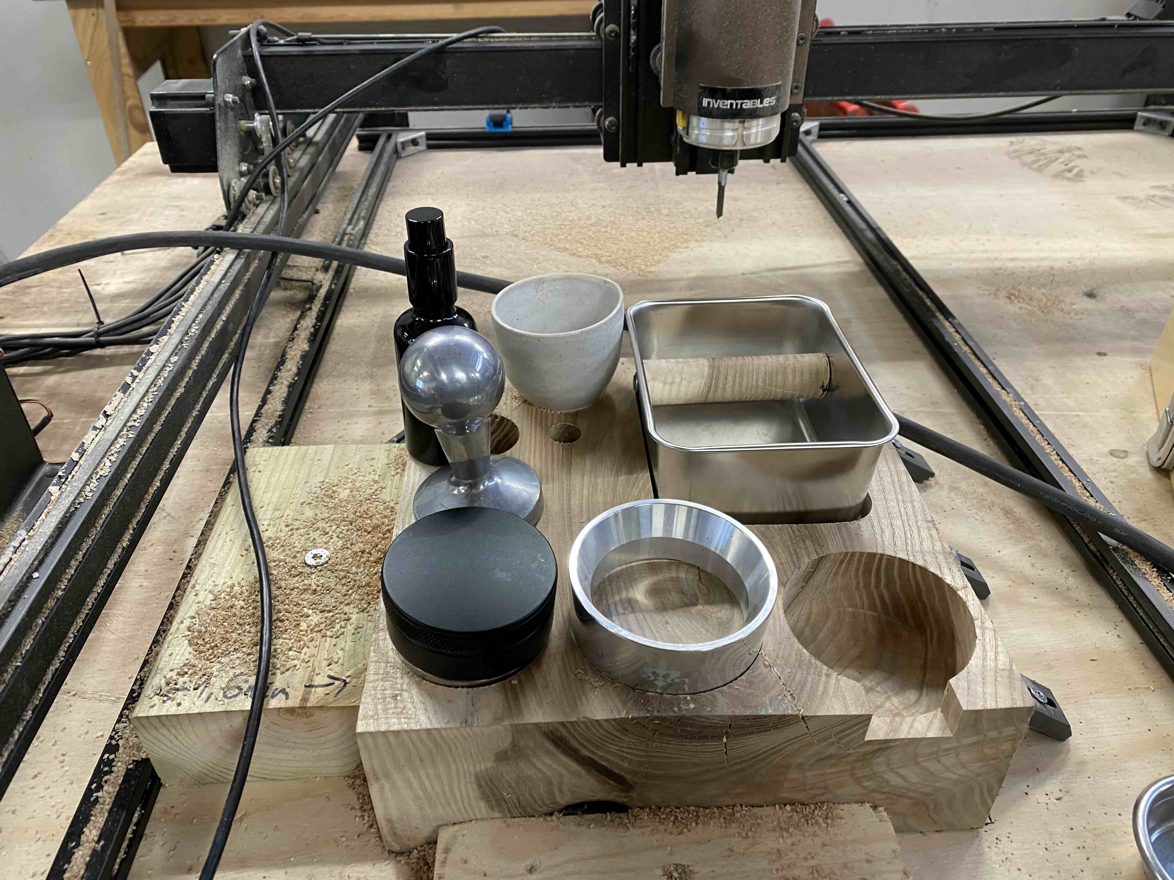 With a flat and even surface, the block was now ready for milling. I tested the layout by placing all the coffee equipment on the wood to evaluate spacing and functionality.