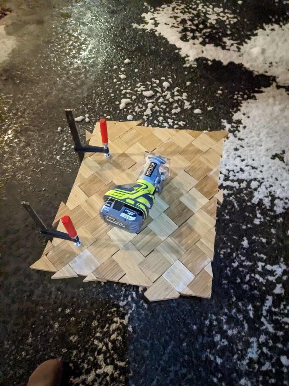 An existing bamboo piece of furniture was cut into evenly sized squares, which were then glued onto a base plate to form the tabletop. The edges were routed afterward to ensure a clean, flush finish.