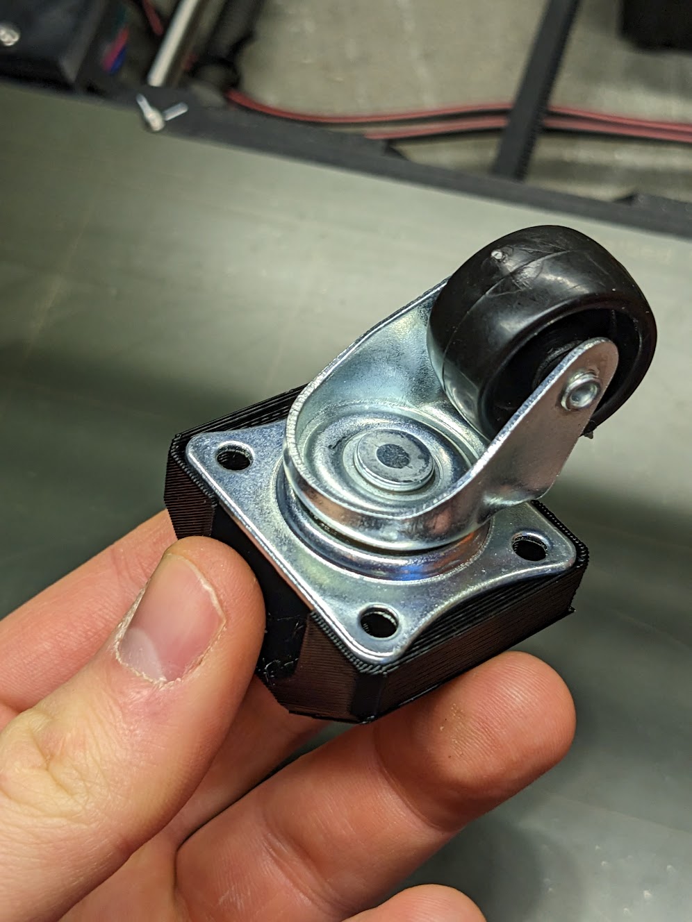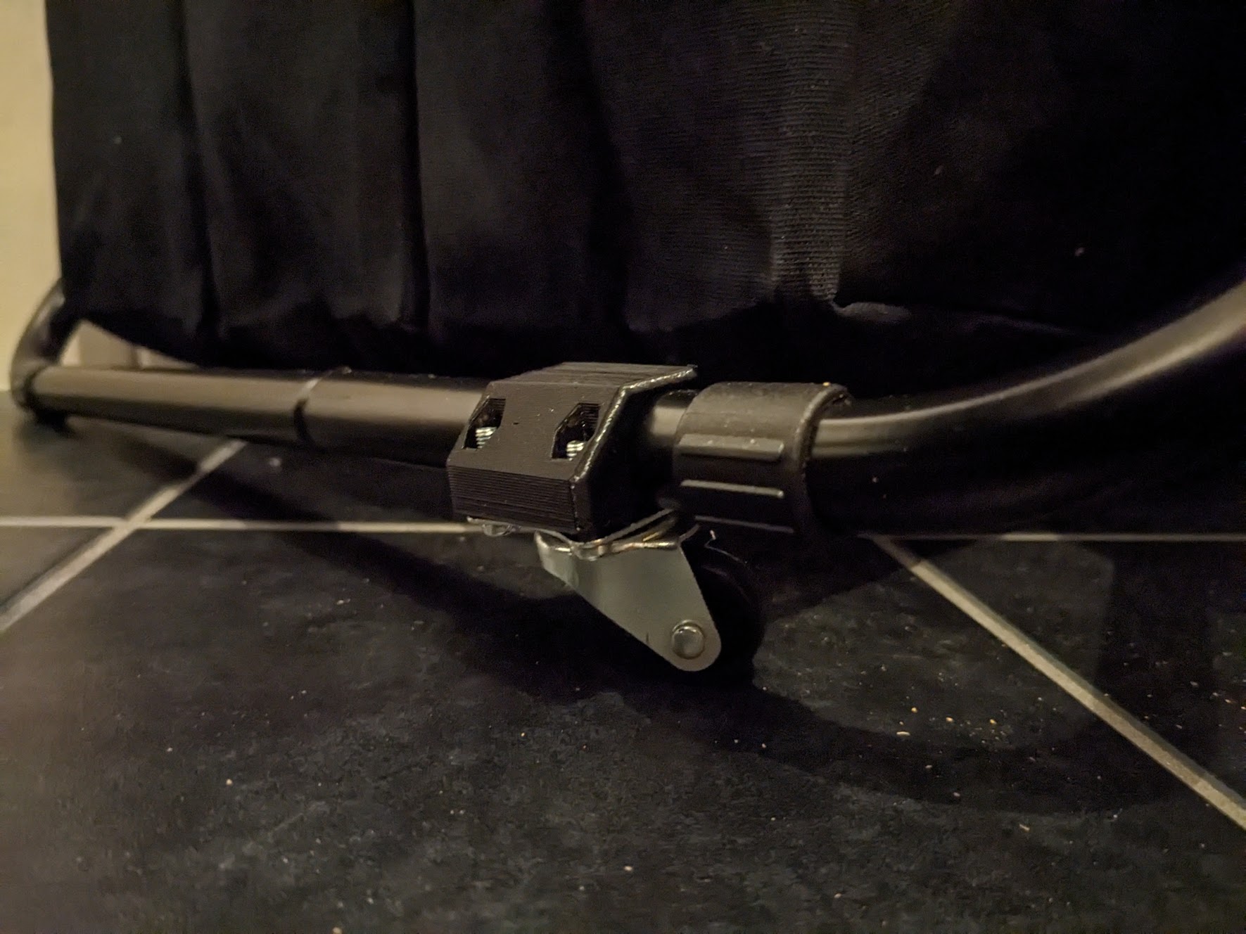To improve usability, wheels were added to the laundry basket, making it easy to slide in and out from under the table. A custom mount for the wheels was 3D printed to securely attach them to the basket’s frame.