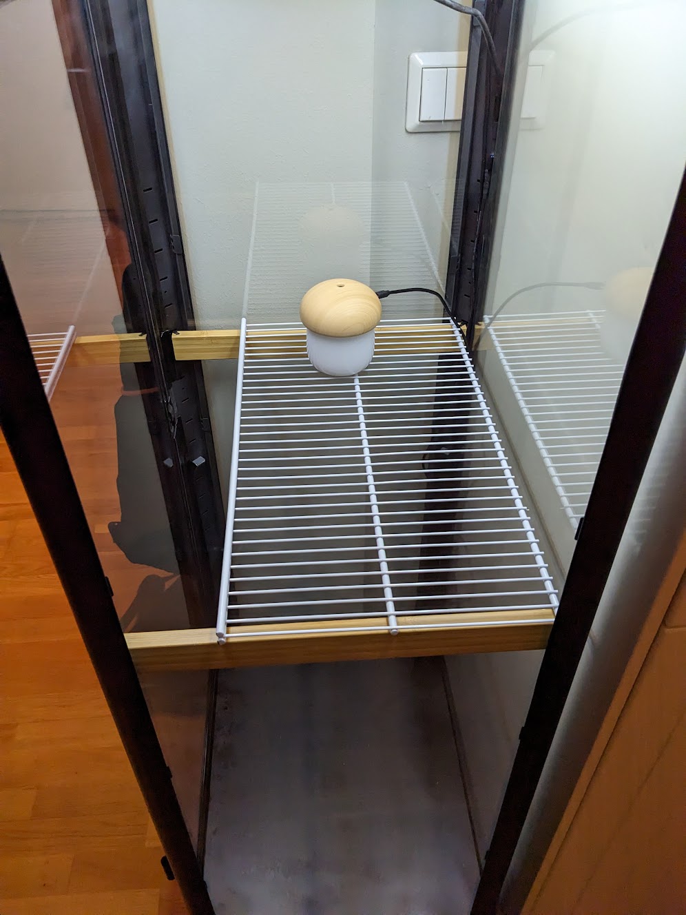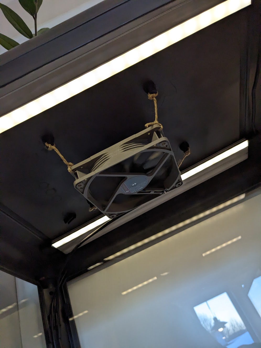 A fan was then mounted to the ceiling of the cabinet using magnets embedded in 3D-printed knobs. From these knobs, strings were attached to suspend the fan slightly lower, creating enough space between the fan and the ceiling for proper airflow.
